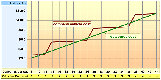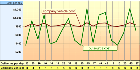 Rush CourierSame-day Delivery Routed / Scheduled Courier Service Overnight Delivery Van Delivery Same Day Truck/Freight Delivery Green Delivery Service > Business Owners In-house vs. Outsource Cut Shipping Costs By OutsourcingOn the previous page, it was demonstrated that most businesses operating a delivery fleet can reduce shipping costs by eliminating excess company vehicles and other resources associated with their shipping operations. Of course, the shipments still have to go out, so here we will compare the cost of outsourcing the "variable" segment of our shipping versus maintaining the in-house resources necessary to service all, or most, of our deliveries.2. Replace high fixed costs with a flexible variable expense.